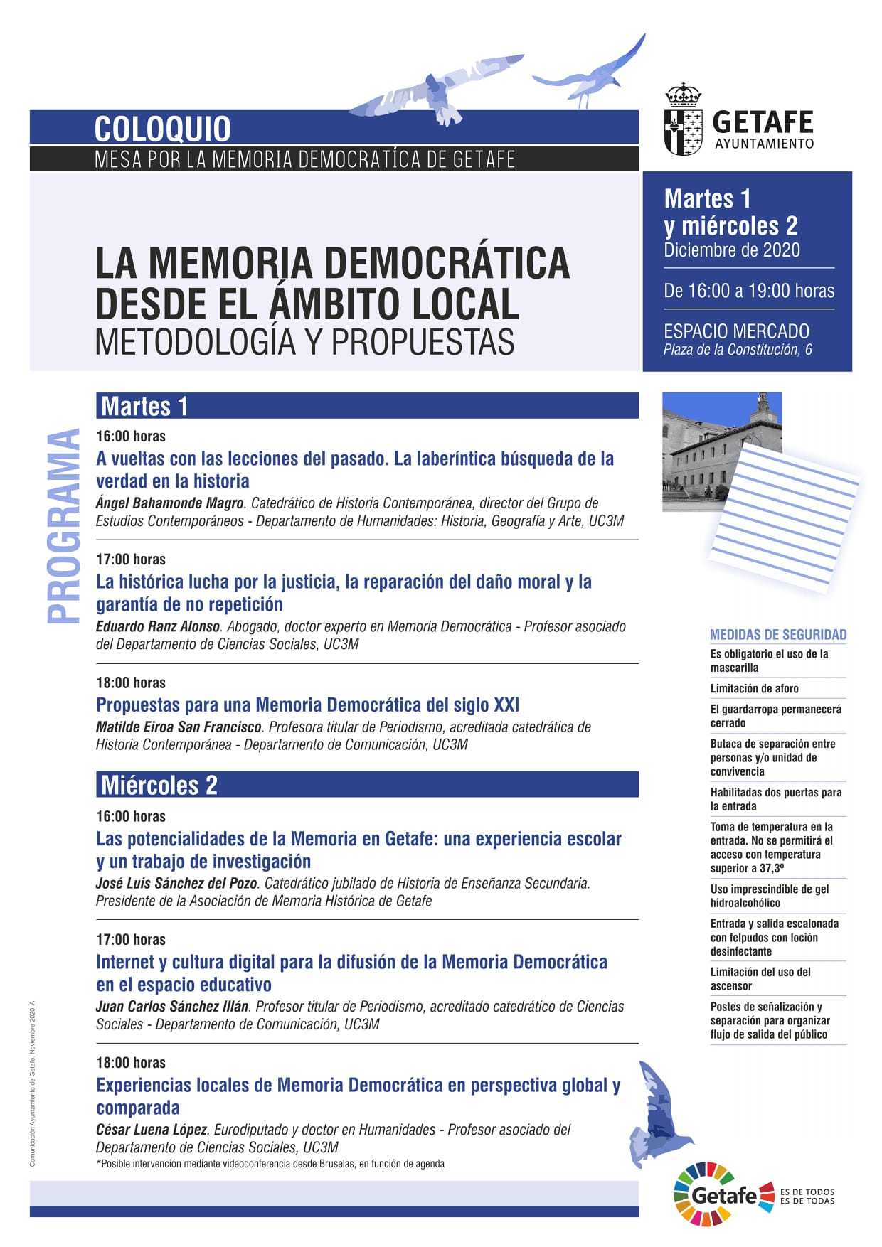 El pasado 1 y 2 de Diciembre de 2020 en el Espacio Mercado, se efectuaron unas jornadas acerca de la memoria democrática perteneciente al ámbito local. El Ayuntamiento de Getafe, mediante la concejalía de Cultura, presentó un programa de ponencias expuestas por profesionales de la disciplina en cuestión. En el siguiente folleto elaborado por la Mesa por la Memoria Democrática de Getafe se especifican los temas tratados durante dichas jornadas de reflexión: